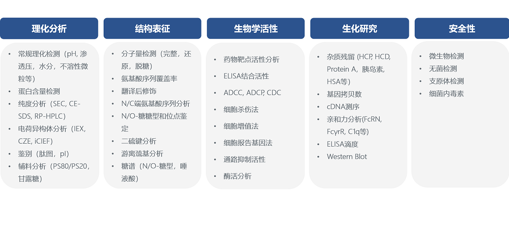 分析方法开发团队拥有先进的仪器设备,具备丰富的单抗,双抗和重组蛋白等pCQA分析与监控的经验,为新药和仿药研发以及IND/BLA申报提供一站式全流程服务,包括: